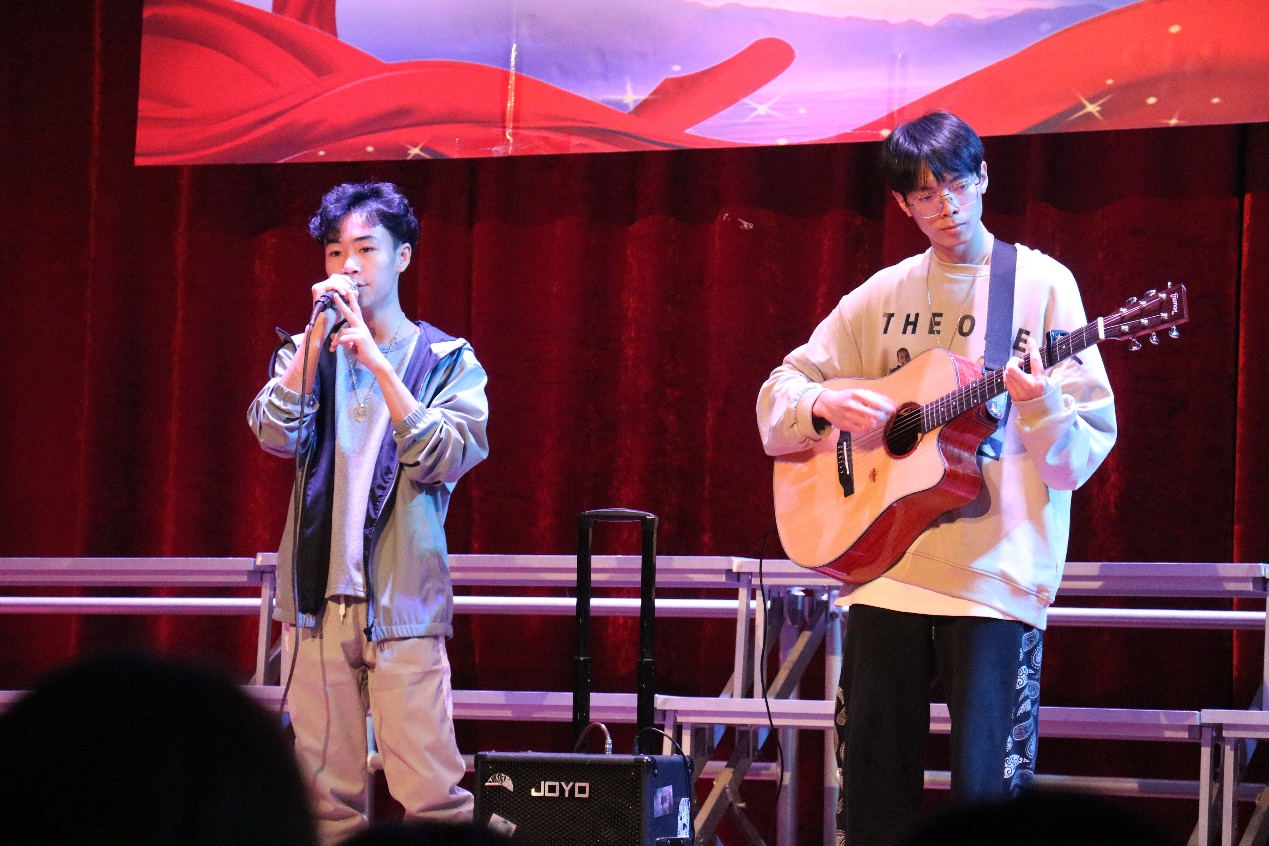 嘉宾演出更是精彩不断,飞久音乐社吉他班带来弹唱表演。梁境轩同学浑厚又富有磁性的声音和胡浩然同学拨着吉他的弦,奏出弯曲的平行线,华光从缝隙倾限,一首《沙龙》将现场气氛拉到最高点。