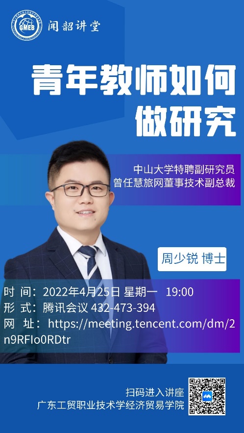 2022年4月25日,经济贸易学院闻韶讲堂之科研主题讲座在线上顺利举行,中山大学特聘研究员周少锐博士给经贸学院整体教师开展“青年教师如何做研究、申请国家级/省级课题”的讲座。