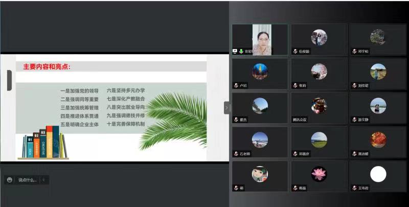 经济社会发展需要越来越多的大国工匠,而培育大国工匠,离不开丰沃的土壤——高质量的职业教育。新《职业教育法》自2022年5月1日起施行,为深入贯彻落实全国职业教育大会精神,做好新《职业教育法》学习宣传工作,5月20日下午,经贸学院国际经济与贸易专业教师在腾讯会议开展了深入学习《职业教育法》的学习研讨会议,研讨会由专业带头人蒋晶主持。