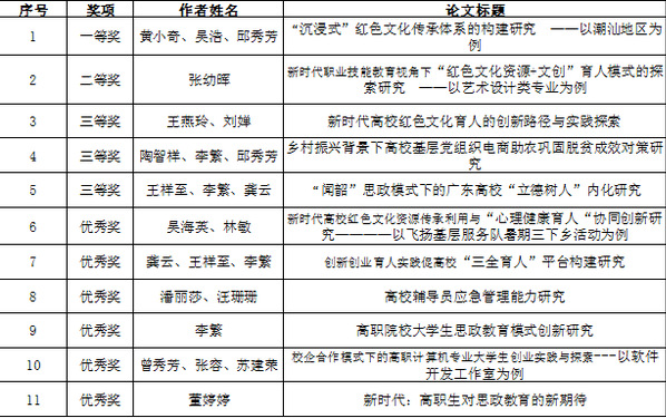 近日,高校思想政治工作队伍培训研修中心(华南师范大学)、教育部高校辅导员培训和研修基地(华南师范大学)、广东省高等学校思想政治教育研究会公布了其组织的2021年度广东高校思想政治工作优秀论文征集活动评选结果,我校获得一等奖一项、二等奖一项、三等奖三项、优秀奖六项,共有24人次获奖,其中黄小奇、吴浩、邱秀芳的《“沉浸式”红色文化传承体系的构建研究》荣获一等奖。