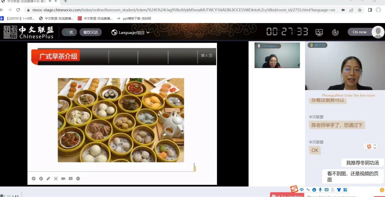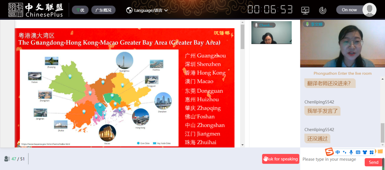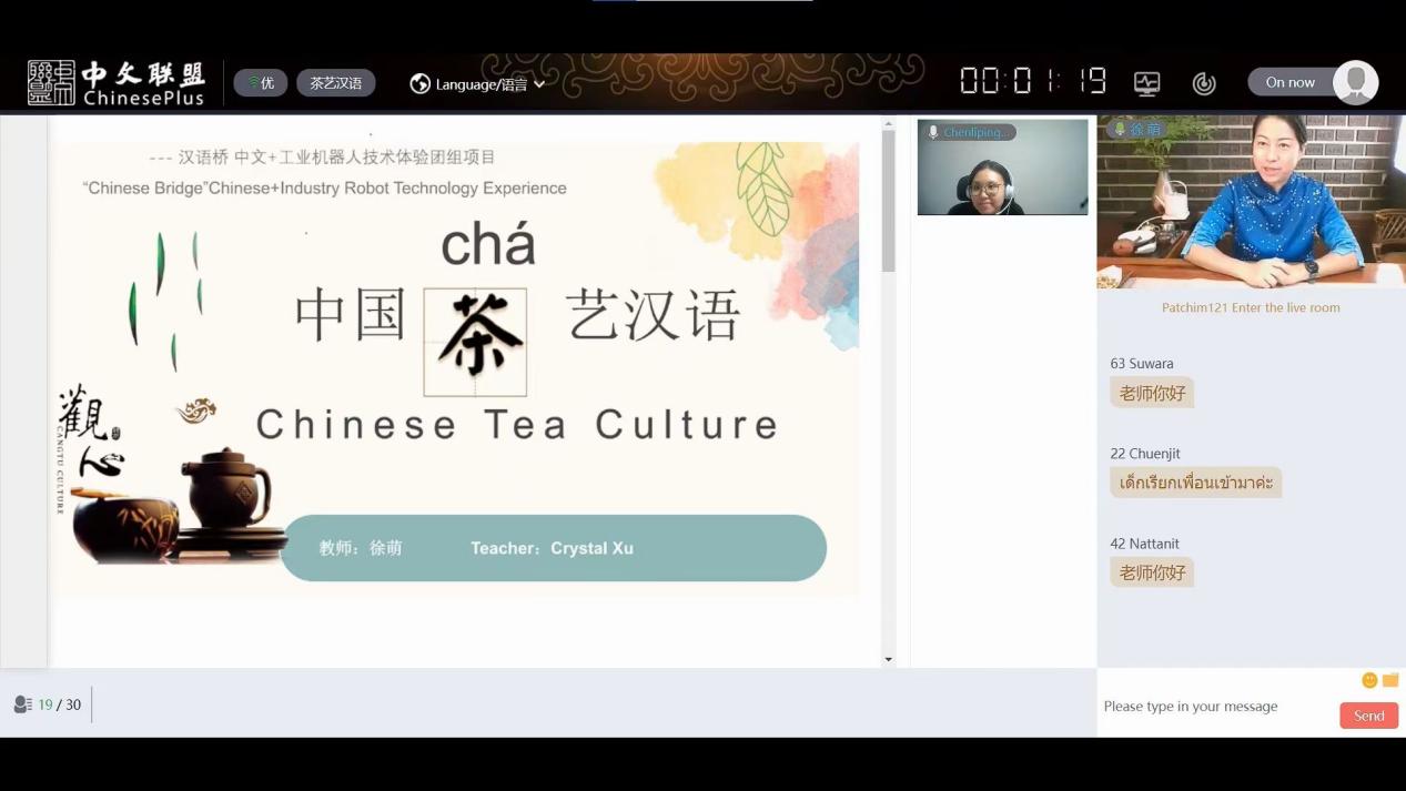 此次体验团由太阳集团城官网1407承办,我学院老师徐萌老师,李文婷老师,廖文芳老师分别于6月27日、7月5日、7月8日通过“汉语桥”远程教学平台以中英双语直播的形式向180多名泰国同学讲授相关课程,并通过生动的视频案例展示中国传统文化,广东本土特色文化等,获得了一致好评。