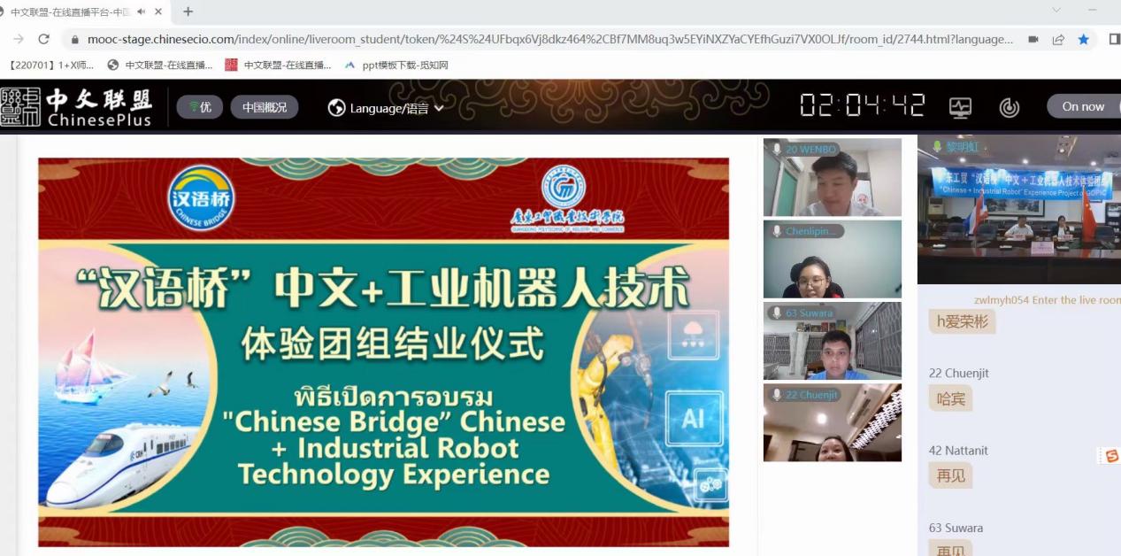 7月8日,2022年度“汉语桥”中文+工业机器人技术体验团结业仪式在线上顺利举行,为期十天的“汉语桥”中文+工业机器人技术体验团项目落下帷幕。该项目获教育部中外语言交流合作中心立项。