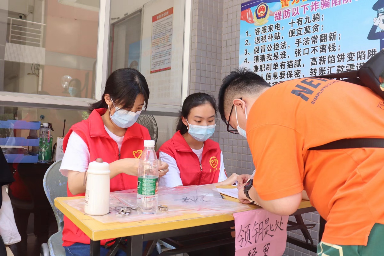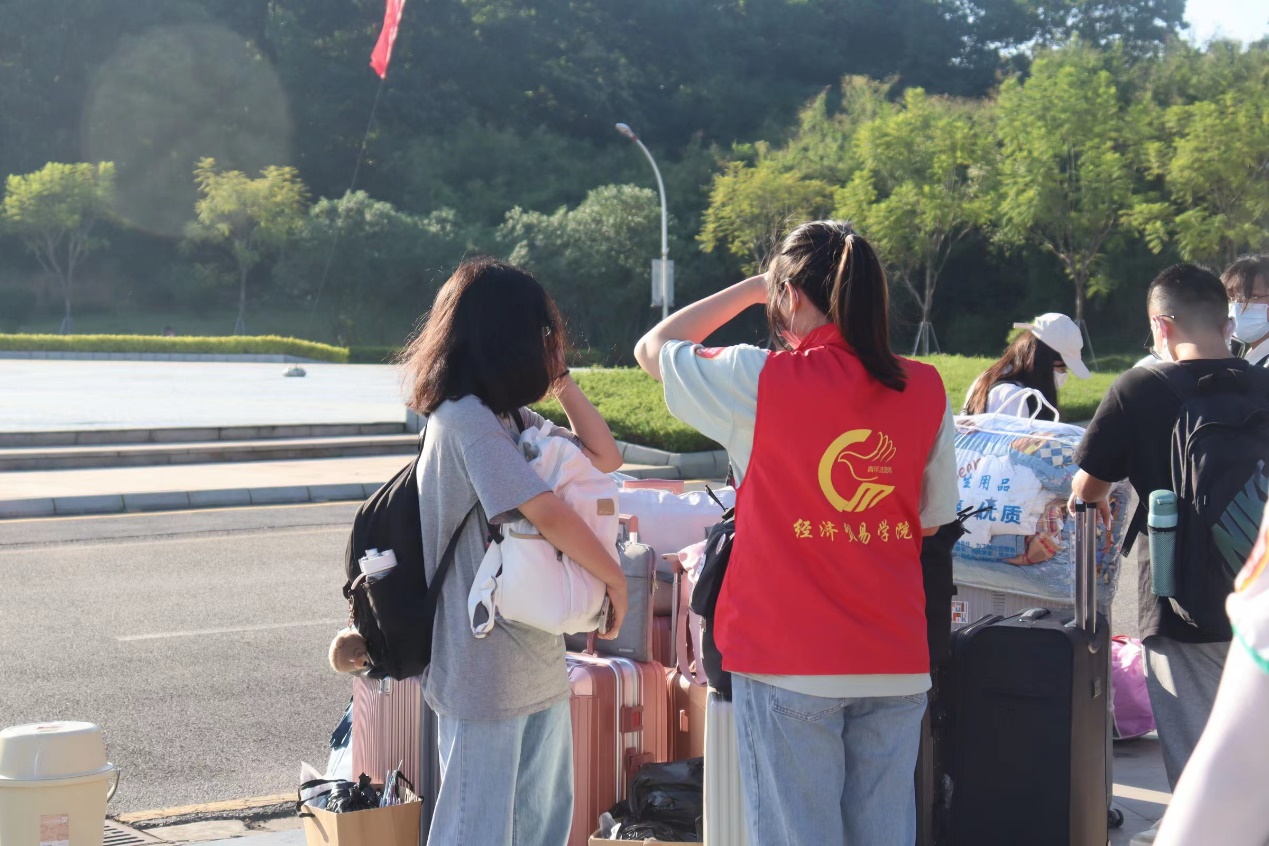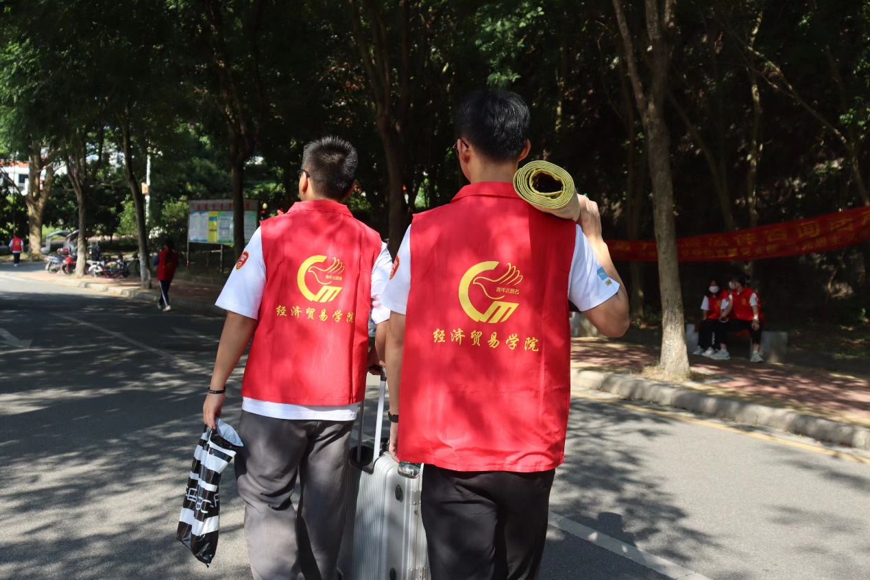 子衿广场及宿舍楼下指引的志愿者也在为新生的到来保驾护航,从在校车停靠处接过行李,到指引新生于宿舍楼领取钥匙并护送上楼。经贸青协志愿者用一张张热情的笑脸,一句句亲切的问候,一项项贴心的服务,欢迎着来自全国各地的莘莘学子,充分诠释了“奉献、友爱、互助、进步”的志愿者精神。