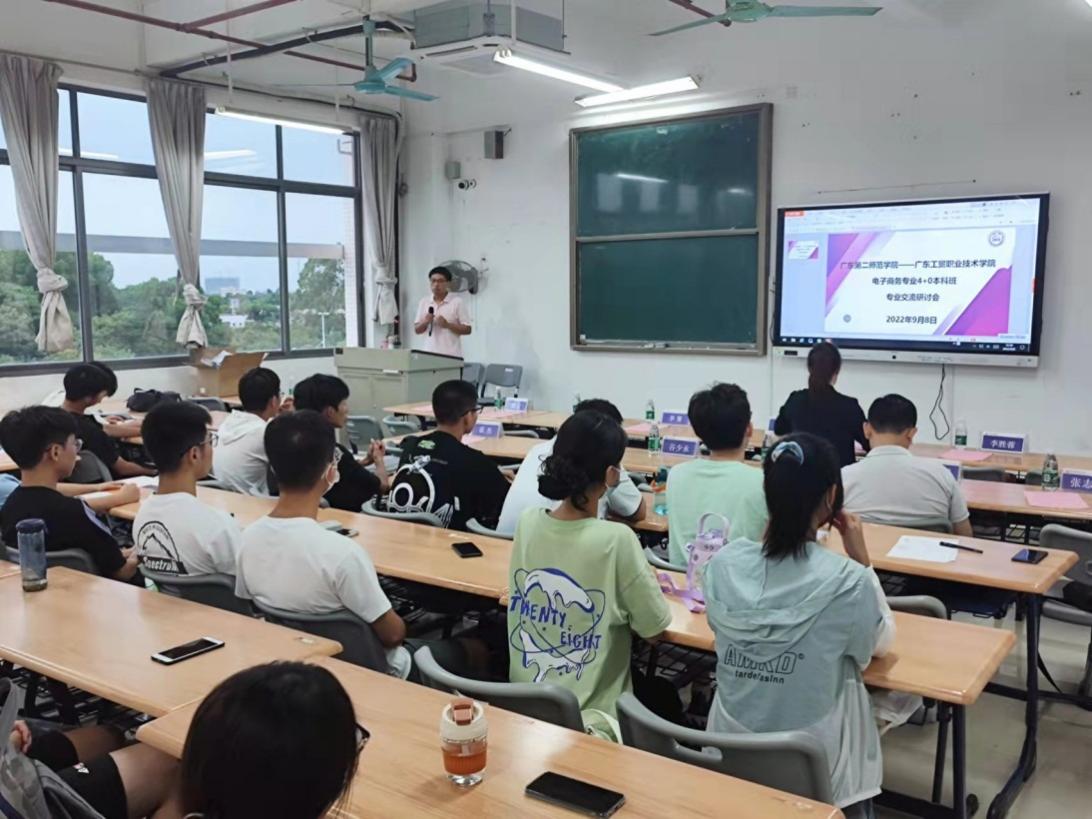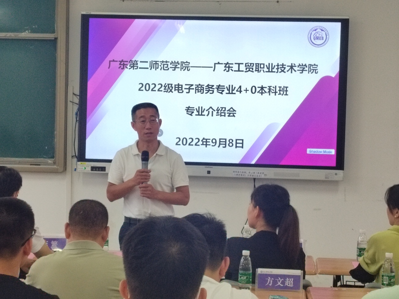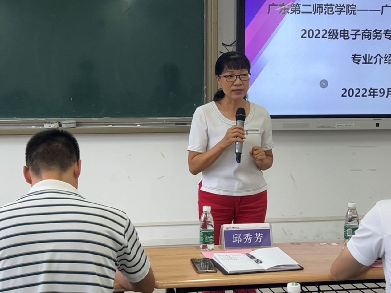 9月8日下午,广东第二师范学院-太阳集团城官网14072022级电子商务专业4+0本科班新生专业介绍会在白云校区明德楼1-405隆重举行。广东第二师范学院管理学院副院长梅晓仁、电子商务专业系主任孙楚、教师代表李胜蓉,太阳集团城官网1407经济贸易学院党总支书记李繁,党总支副书记、院长邱秀芳,党总支副书记龚云,副院长蒋晶,商贸系副主任谷少永,电子商务专业带头人方文超,电子商务专任教师伍炜勤及22级本科班学生参加专业介绍会议。会议由方文超主持。
