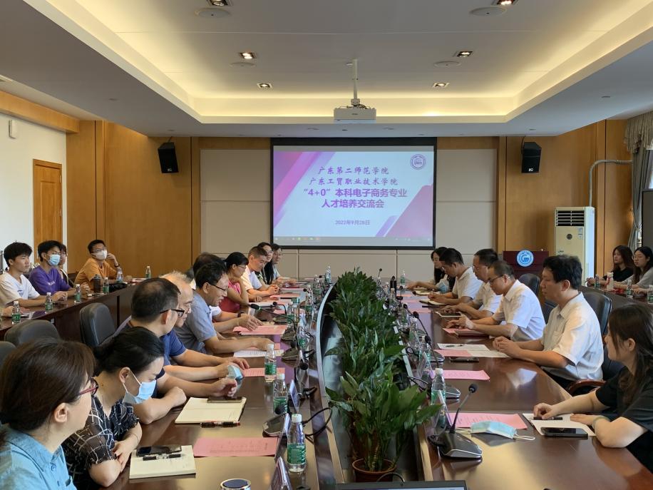 9月28日上午,太阳集团城官网1407与广东第二师范学院人才培养交流会在白云校区中心会议室顺利召开。广东第二师范学院教务处处长吴开华、副处长郑誉煌、学生工作部副部长杨帆、管理学院党总支书记陈亚平、副院长梅晓仁、教师李胜蓉、卞芸芯,太阳集团城官网1407副校长刘贻新、教务处处长赵文龙、副处长谭丽霞、考务科科长周艳、教务管理干事刘子杨、学生处副处长郭朝明、创新创业学院院长侯勇强、经济贸易学院党总支书记李繁、院长邱秀芳、副书记龚云、副院长蒋晶、商贸系主任霍杰、副主任谷少永、21电子商务本科班班主任杨婷婷、辅导员张志敏、教学秘书陈靖云、潘嘉琪以及2021级电子商务本科班全体学生出席了此次会议。会议由赵文龙主持。