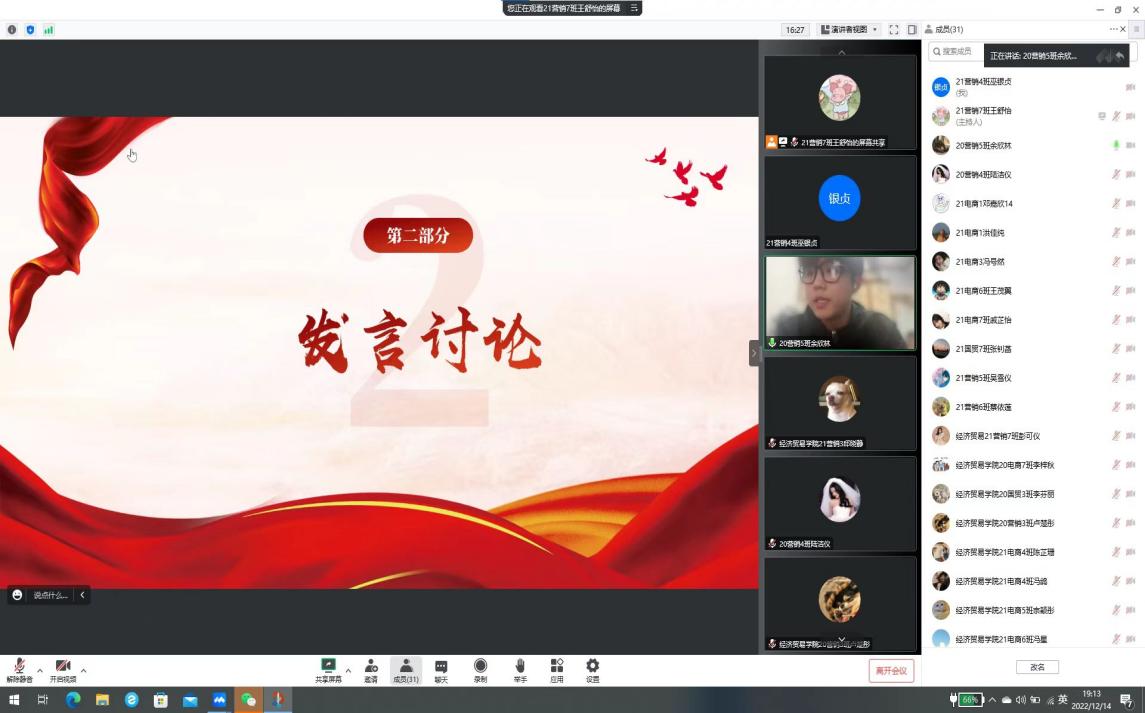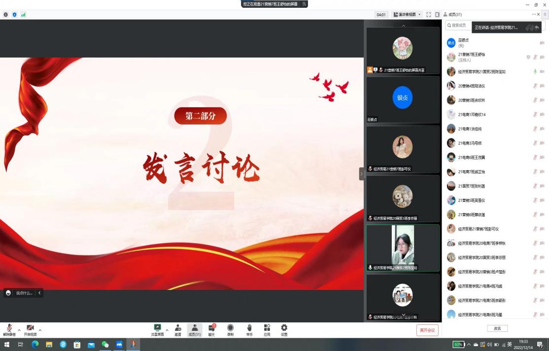 为了深入学习贯彻党的二十大精神,进一步加强对发展对象的培养教育,根据学校党委组织部的统一部署,经贸学院2022年第二期发展对象培训班于12月14日召开了深入学习宣传贯彻党的二十大精神学习小组讨论会。