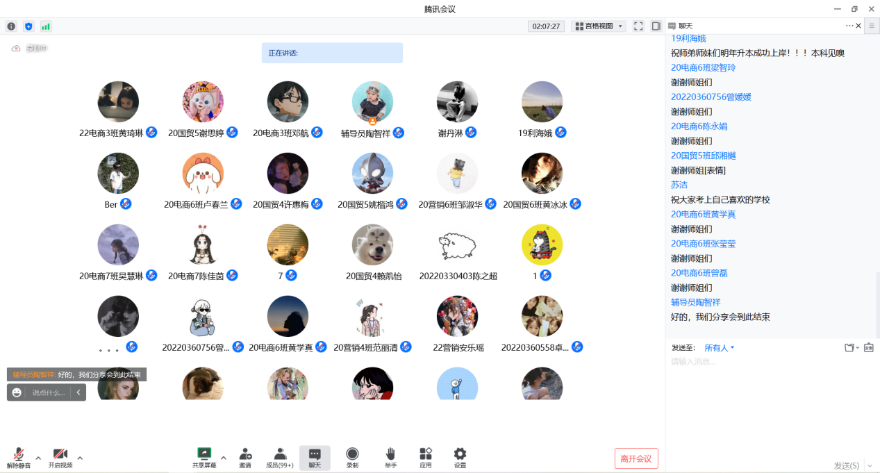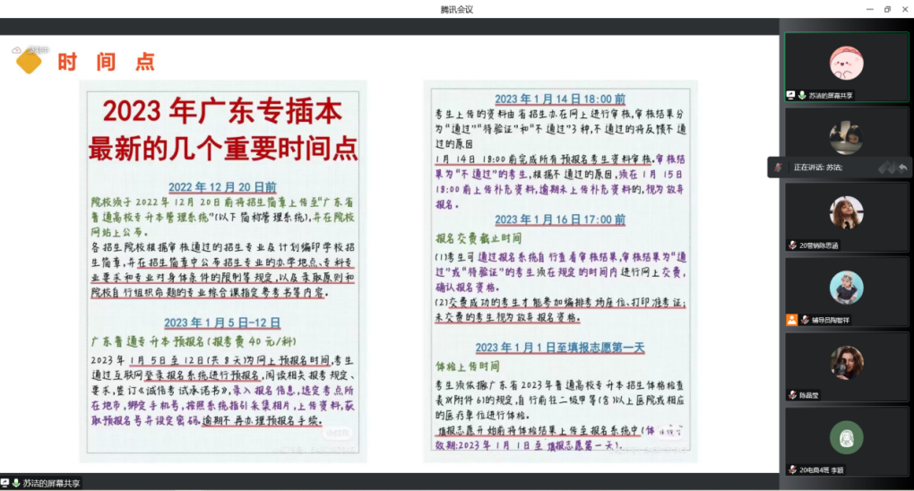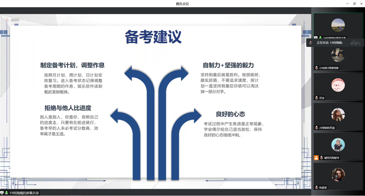 群鸿飞四海,爱心留故园;海阔凭鱼跃,天高任鸟飞。为深入学习贯彻党的二十大精神,切实做好2023届毕业生普通专升本工作,帮助毕业生更好的备考,12月13日下午,经济贸易学院通过腾讯会议线上组织召开了2023届毕业生普通专升本备考经验分享会。会议邀请了成功专升本的往届优秀毕业生18电商1班陈晶莹、18电商3班苏洁、19国贸4班利海娥为23届毕业生分享升本经验。学院党总支副书记龚云、分管毕业班的辅导员出席本次分享会,会议由经贸学院就业联络员陶智祥主持。