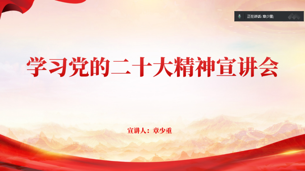 12月12日,根据学校党委《开展党的二十大精神宣讲行动的实施方案(粤工贸院党字〔2022〕59号)》要求,学校党的二十大精神宣讲团成员、经济贸易学院辅导员章少重通过线上方式组织了一场题为“践行党的二十大 奋进新征程”宣讲会,为我校市场营销专业学生宣讲党的二十大精神。