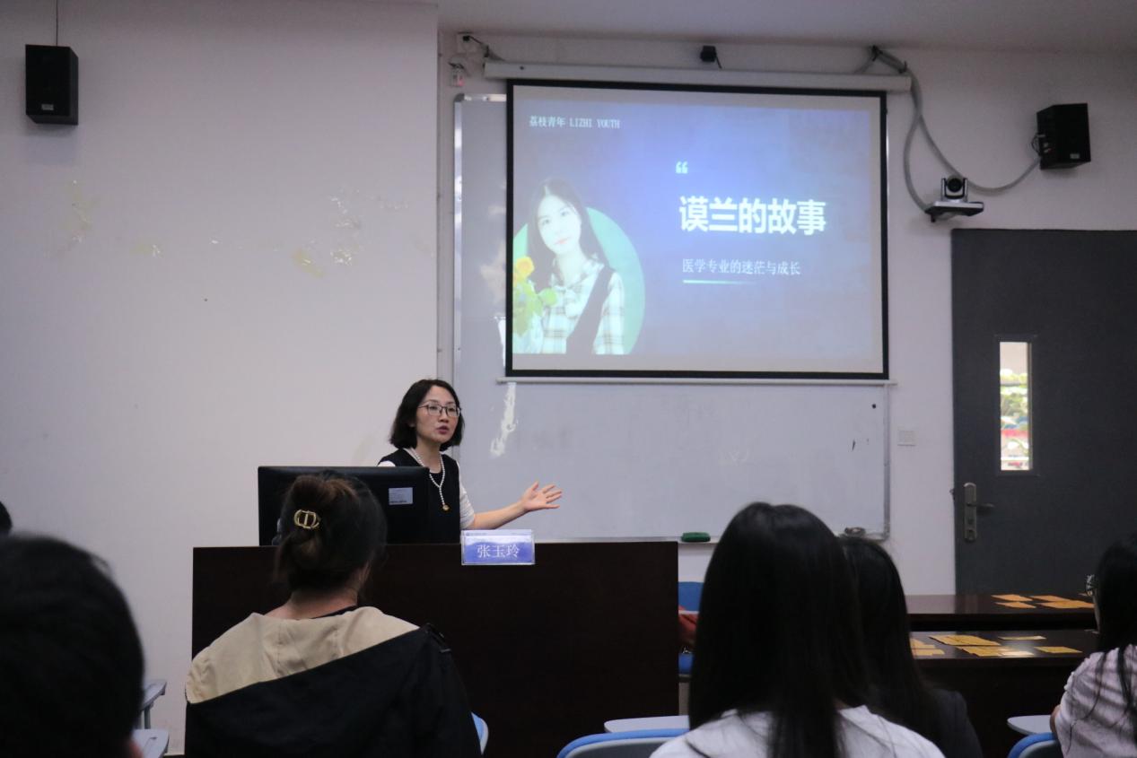 不仅如此,张玉玲还分享两个故事,分别是谟兰的故事——医学专业的迷茫成长、陈智泓的故事——医学加营销的全新成长蜕变。通过故事的分享,让同学们明白“成就青年,青年有成就”和“让优秀的人影响更优秀的人”。