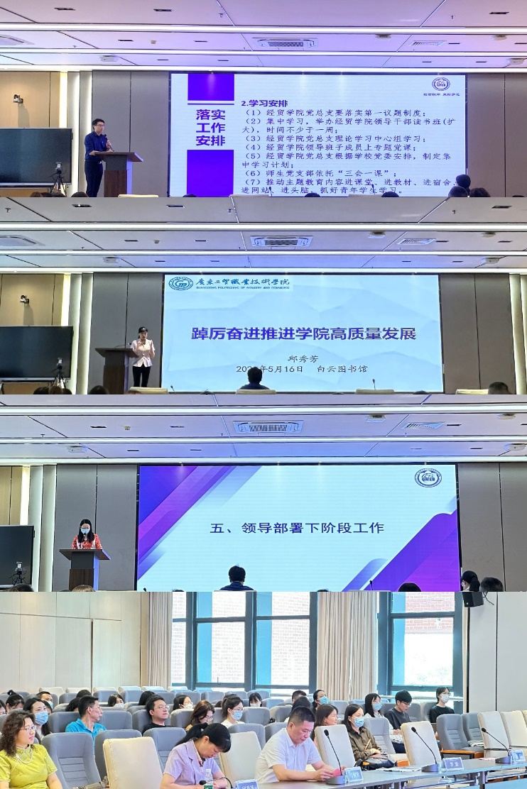 5月16日下午,经济贸易学院在白云校区图书信息楼629会议室全体教职工大会,开展主题教育学习并推进相关工作。学院联系校领导、学校党委委员、副校长唐毓秋,经贸学院党总支书记李繁,党总支副书记、院长邱秀芳,副院长蒋晶及全体教职工参加会议。会议由李繁主持。