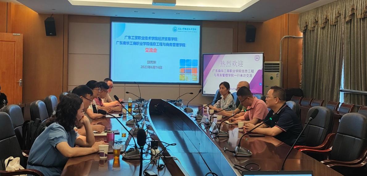 为打造校际间专业共建和资源共享合作机制,实现高质量共赢发展,6月16日上午,广东南华工商职业技术学院信息工程与商务管理学院常务副院长肖伟、电子商务群主任陈华毅、电商负责人佘碧蓉及骨干教师彭韬一行来到我校经济贸易学院访问交流,双方于明德楼1-201会议室举行交流座谈会。经济贸易学院院长邱秀芳、营销系主任严琳、商贸系主任霍杰、商贸系副主任谷少永、市场营销专业带头人黄华乾博士以及双方学生代表出席本次会议。