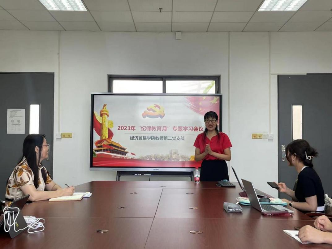 为深入学习贯彻习近平新时代中国特色社会主义思想和习近平总书记视察广东重要讲话、重要指示精神,深化自我革命,全面从严治党,根据学校印发的《2023年纪律教育学习月活动实施方案》的要求,9月4日下午,经济贸易学院教师第二党支部在白云校区1-304组织开展支部纪律教育学习月集中学习。会议由支部纪检委员李文婷主持,全体党员参加。