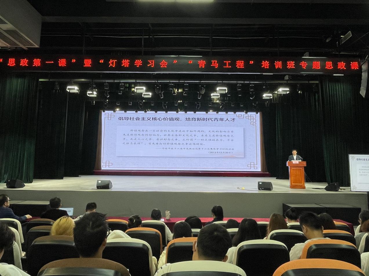 为深入学习宣传贯彻习近平新时代中国特色社会主义思想和党的二十大精神,落实习近平总书记关于思政课建设的重要指示,强化学校党政领导抓思政课建设的主体责任,落实学校共青团年度工作要点,根据《广东省教育厅关于做好2023年秋季学期大中小学校党组织书记、校长上第一堂思政课工作的通知》要求,12月12日,学校党委委员、副校长唐毓秋在白云校区学生活动中心为同学们讲授“思政第一课”暨“灯塔学习会”“青马工程”专题思政课。学生工作处副处长郭朝明、经贸学院党总支副书记龚云、经贸学院辅导员、学生代表和学校学生会、青马工程培训班学生代表等共计330余人参与了课程。活动由学校团委书记陈冠锋主持。