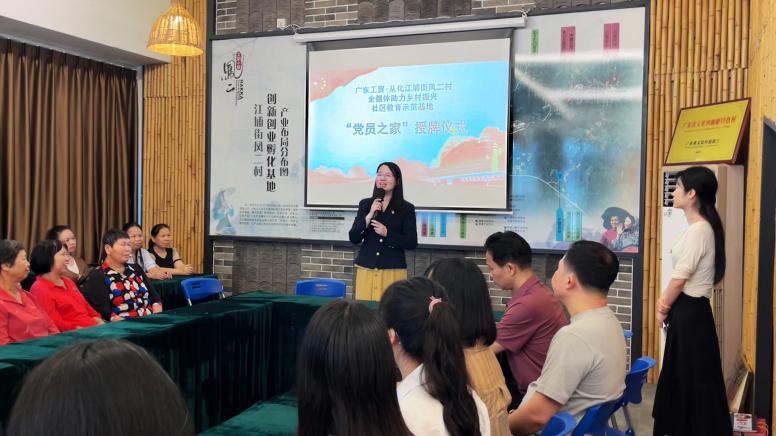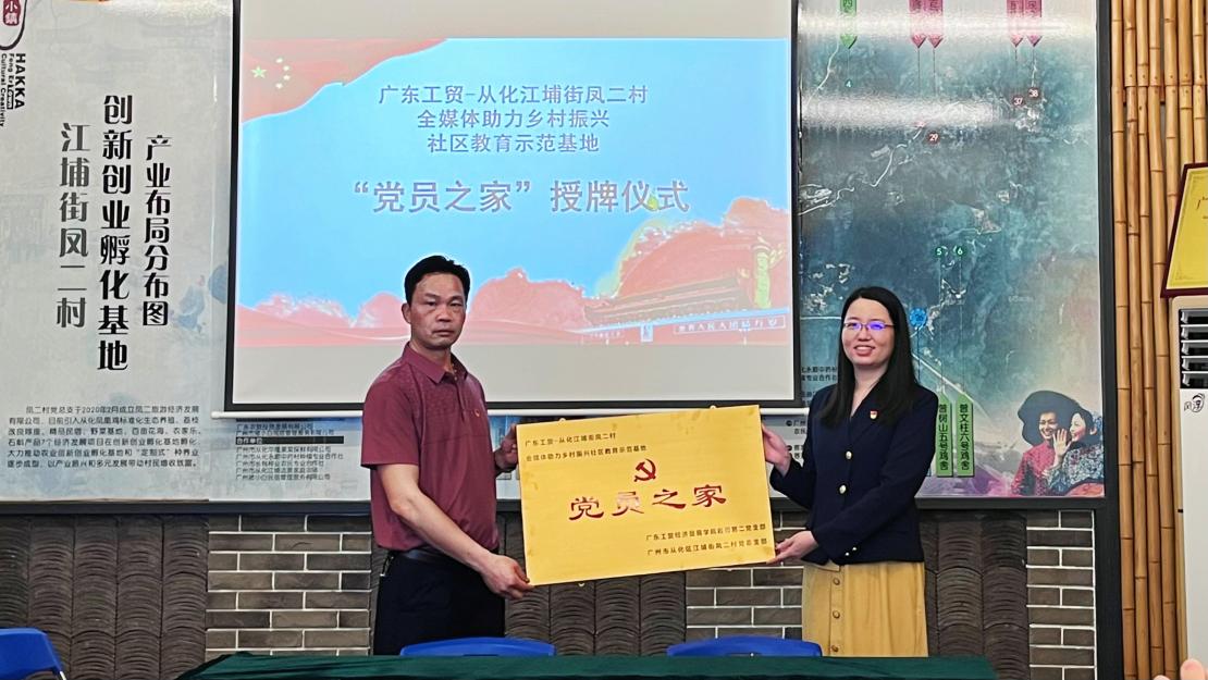 为落实广东省教育厅关于实施继续教育质量提升工程的通知,太阳集团城官网1407经济贸易学院与从化江埔街凤二村共同创建全媒体助力乡村振兴社区教育示范基地。5月23日上午,广东工贸凤二村全媒体助力乡村振兴社区教育示范基地“党员之家”授牌仪式暨党建结对共建座谈在凤二村举行。会议由经贸学院教师张莉主持,经贸学院副院长蒋晶、凤二村第一书记李学超,凤二村党总支书记李铝平、凤二村党总支委员谢刘雨、经贸学院骨干教师黄诗媛、卢岩、陈秋娜、何志伟、辅导员李彩丽、学生党员、凤二村委、党员及村民共同参加。