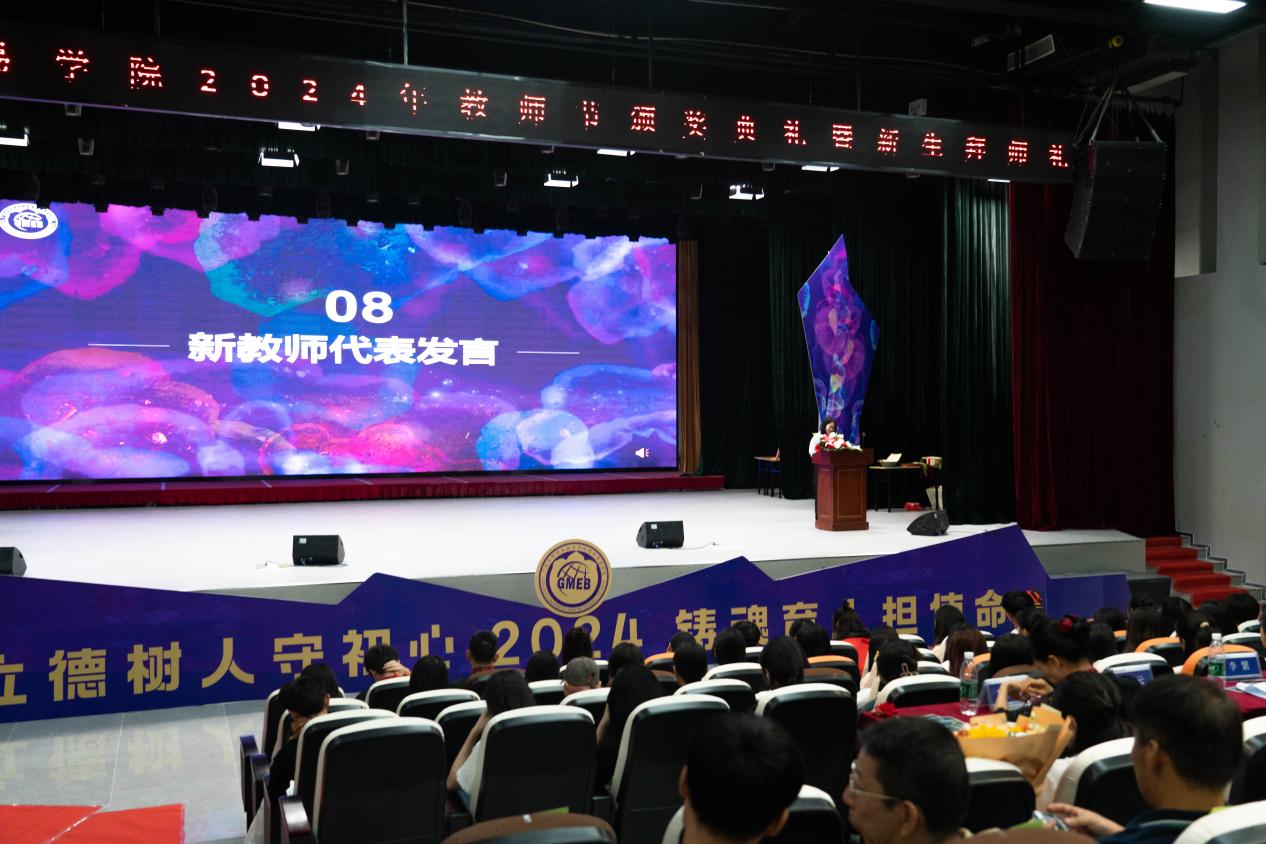 一支粉笔,两袖微尘,三尺讲台,四季耕耘。在这充满诗意与温情的秋色中,我们迎来了全国第40个教师节。为深入学习贯彻党的二十大精神,全面贯彻党的教育方针,聚焦师德建设主题教育月“大力弘扬教育家精神,加快建设教育强国”主题,经济贸易学院于9月24日下午2:10在白云校区学生活动中心演艺厅隆重举行2024年教师节颁奖典礼暨新生拜师典礼。会场内灯光璀璨、座无虚席,学院师生齐聚一堂,共同见证了这一庄重而充满意义的典礼。此次典礼旨在表彰在教育事业中做出突出贡献的教师、为新入职的教师举办“传帮带”仪式,并为新生举行庄严的拜师仪式。经贸学院党总支书记李繁、党总支副书记龚云、副院长蒋晶以及全体教职员工及新生代表近500人参加了本次典礼。