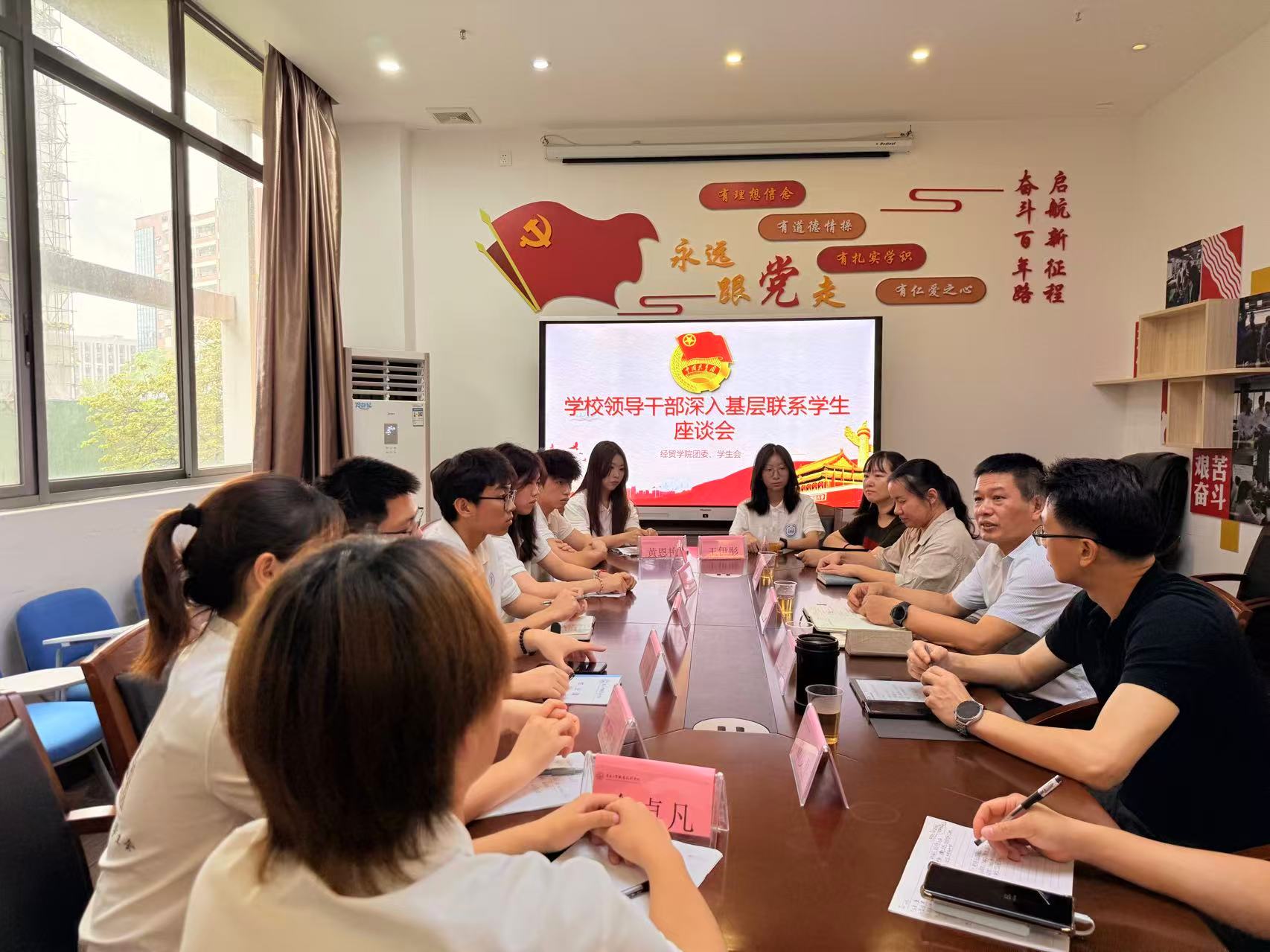 为深化“一站式”学生社区建设,推动团学组织高质量发展,5月16日下午,学校党委委员、副校长唐毓秋深入经济贸易学院,与学院团学骨干开展专题座谈会。经贸学院党总支书记李繁主持会议,学工办主任兼团委书记黄小奇、团委副书记章少重等老师及8名团学骨干参会。