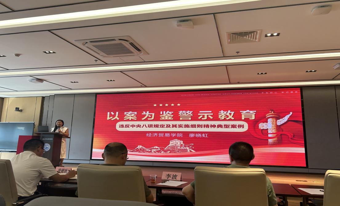 为推动深入贯彻落实中央八项规定及其实施细则精神精神学习教育走深走实,2025年9月2日下午,经济贸易学院教师第一党支部在博学楼629会议室开展“以案为鉴”中央八项规定精神专题警示教育。会议由经济贸易学院教师第一党支部书记廖晓虹主持。