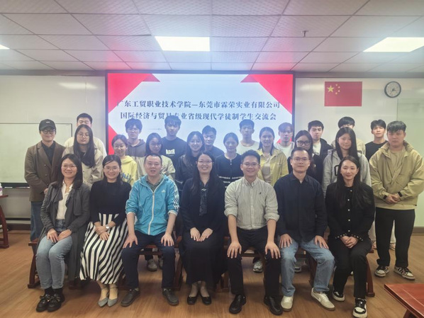 10月22日,经济贸易学院与东莞市霖荣实业有限公司联合举办国际经济与贸易专业省级现代学徒制交流会。学院院长蒋晶、副院长甘朝阳及教师代表,东莞霖荣实业有限公司总经理黄俊,以及24、25级国际经济与贸易专业现代学徒制班级学生共同参会。