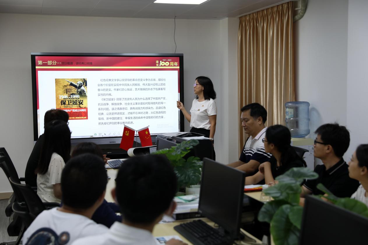 活动初始,首先由党支部纪律委员张小兰分享解读《保卫延安》、《青春之歌》、《红岩》三部红色经典文学作品。《保卫延安》描写了解放战争中的延安保卫战,生动描绘出一幅真实、壮丽的人民战争的历史画卷。《青春之歌》描述了爱国学生及革命知识分子在中国共产党领导下进行斗争生活的情景,说明了个人只有将前途与国家命运相结合,才能拥有美丽青春的道理。《红岩》讲述了齐晓轩、江雪琴等共产党人在狱中进行英勇战斗的故事,展现了共产党人视死如归的大无畏英雄精神。她以这三部红色文学作品为例,从四个方面阐释了如何以红色文学作品助力党史学习教育。