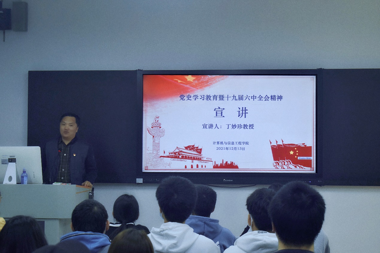 12月13日下午,学校党史教育宣讲团丁妙珍教授来计算机与信息工程学院做党的十九届六中全会精神专题宣讲报告。计算机学院党总支书记张宁主持宣讲会,计算机学院师生代表参加。
