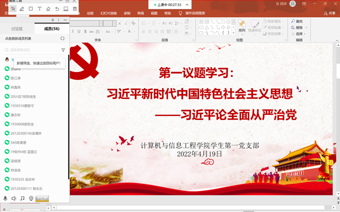 为深入学习贯彻习近平新时代中国特色社会主义思想、十九大和十九届历次全会精神、十九届中纪委六次全会、十二届省纪委七次全会以及全省教育系统全面从严治党会议精神,按照学校党委、学院党总支的要求,计算机学院学生第一党支部于4月19日开展2022年专题纪律教育月学习,支部书记古民华主持会议,全体党员参加了学习。