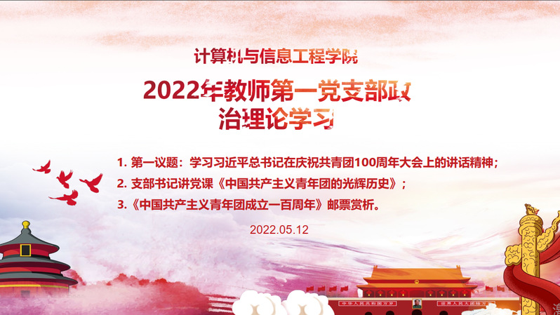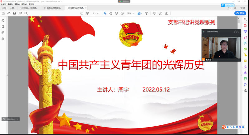 为深入学习贯彻习近平总书记在庆祝中国共产主义青年团成立100周年大会上的重要讲话精神,以更加昂扬的姿态在实现中华民族伟大复兴中国梦的新征程上奋勇前进,计算机与信息工程学院教师第一党支部于5月12日以线上的形式开展了政治理论学习会,会议由教师第一党支部书记周宇主持。