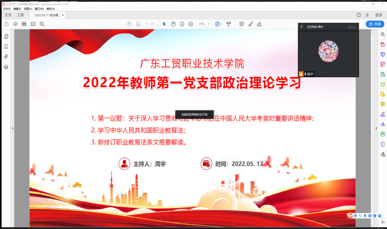 5月17日,计算机与信息工程学院教师第一党支部召开政治理论学习会,学习习近平总书记在中国人民大学考察时重要讲话精神以及《中华人民共和国职业教育法》。会议由教师第一党支部书记周宇主持。