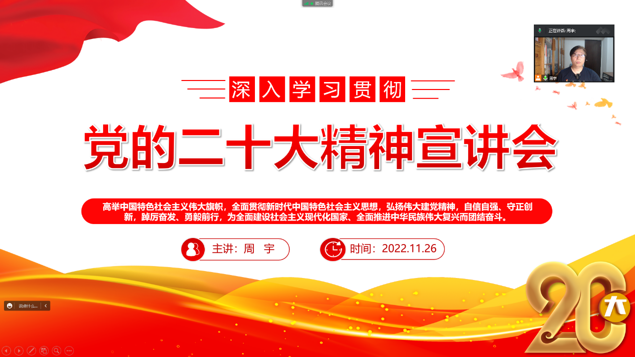 11月26日晚,计算机与信息工程学院教师第一党支部书记周宇通过腾讯会议为支部全体党员、21级和22级数媒系学生合共273人开展深入学习党的二十大精神宣讲,本次宣讲的主题为《踔厉奋发新征程,勇毅前行向未来 》。