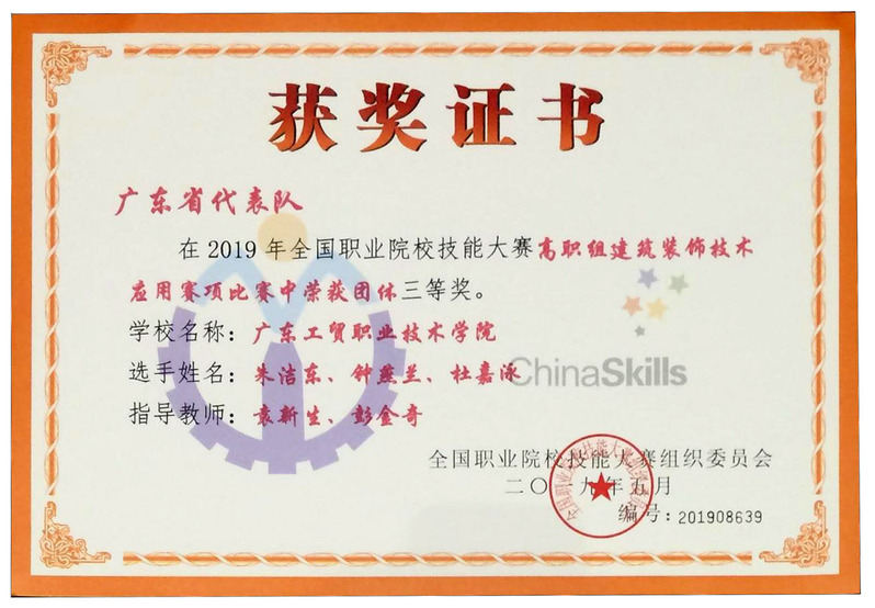 太阳集团城官网1407首次组织参加该赛项,机电学院游凯副院长作为领队,袁新生、彭金奇老师作为指导老师,朱洁东、钟燕兰、杜嘉泳三名同学作为队员;选手和老师们在获得2019年广东省职业院校技能大赛“建筑装饰技术应用(高职组)”省赛一等奖取得该赛项的国赛资格基础上积极训练,努力备战,最终在国赛的赛场上,获全国赛的“三等奖”,实现了技能大赛该项目省赛、国赛的突破。