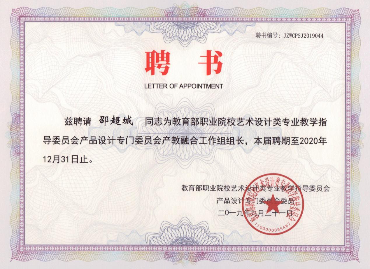 “产品设计专门委员会”经教育部艺术设计教职委核准,该专委会包含“产品设计工作组”、“家具设计工作组”、“陶瓷设计工作组”、“美术设计工作组、”“理论研究工作组”、“产教融合工作组”与“书证融通工作组”等7个工作小组。我校机电工程学院邵超城书记被聘为“产品设计专门委员会产教融合工作组”组长。
