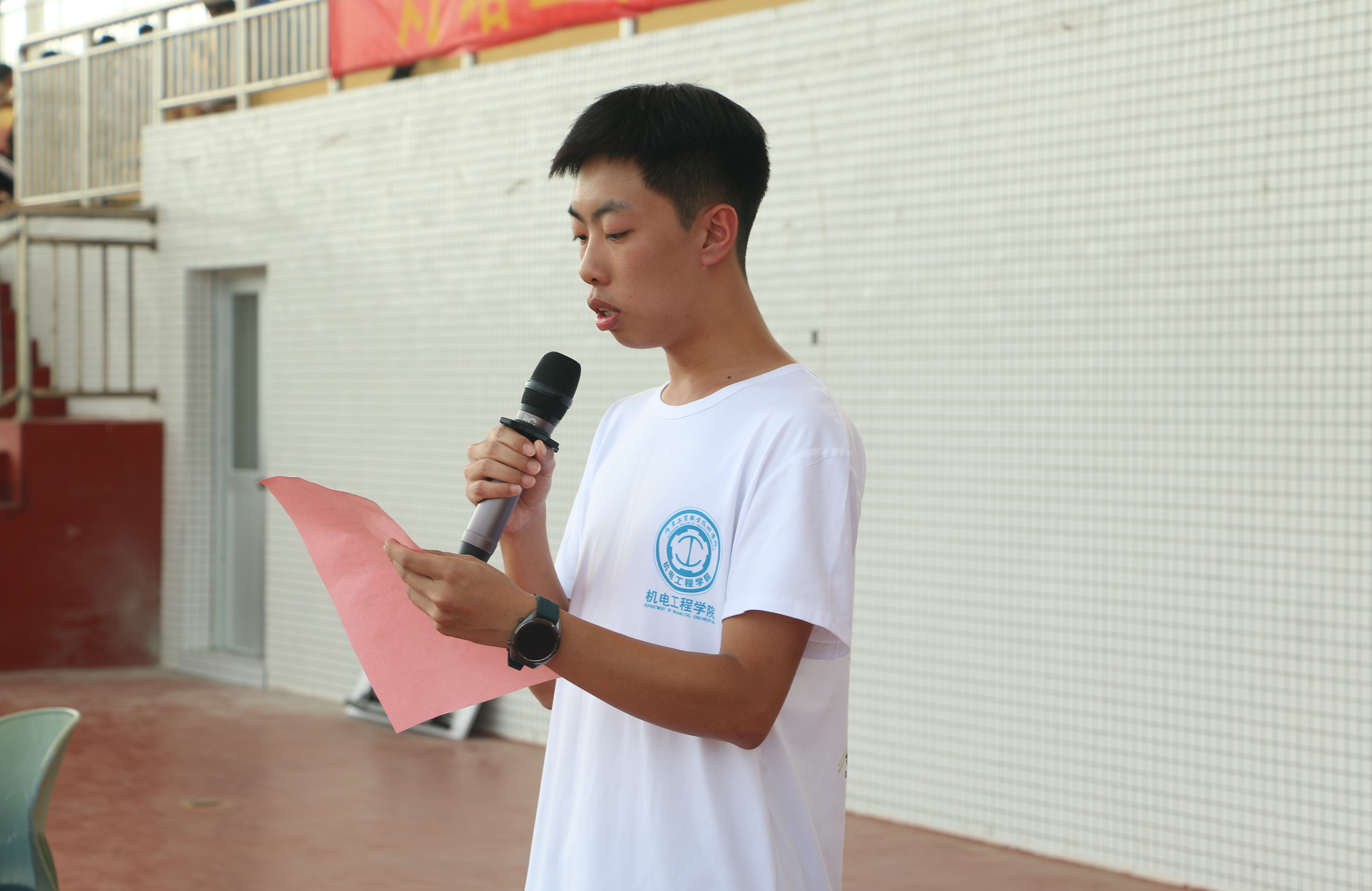 比赛开始之前,机电工程学院学生会各部门认真的布场,他们忙碌的背影彰显了对活动的重视和期盼。比赛开始时,主持人那些激动人心的鼓励语更是让运动员们激情澎湃!运动场上,各项目的参赛选手已在参赛地点就位,田径运动员们在枪声响起的一刹那如箭在弦飞刺而出,在同学们的加油呐喊声中一个个运动健儿冲过终点;铅球运动员们挥舞着充满力量的双臂,抛出一条美丽的弧线;三级跳远和跳远的同学们,怀着心中坚定的信念,脚下踏着沉稳的步伐,奋力发挥出自己所能,争取最优的成绩。每一项比赛结束后,主持人在主席台上宣布各项成绩前8名运动员,并向他们颁发荣誉证书。