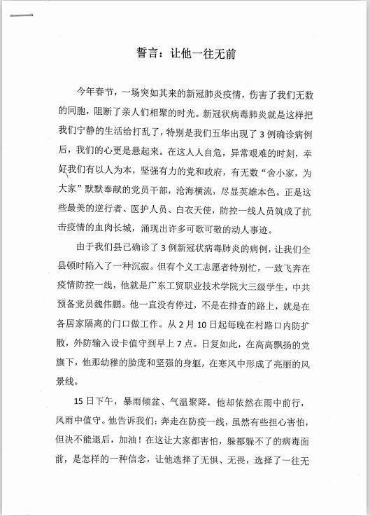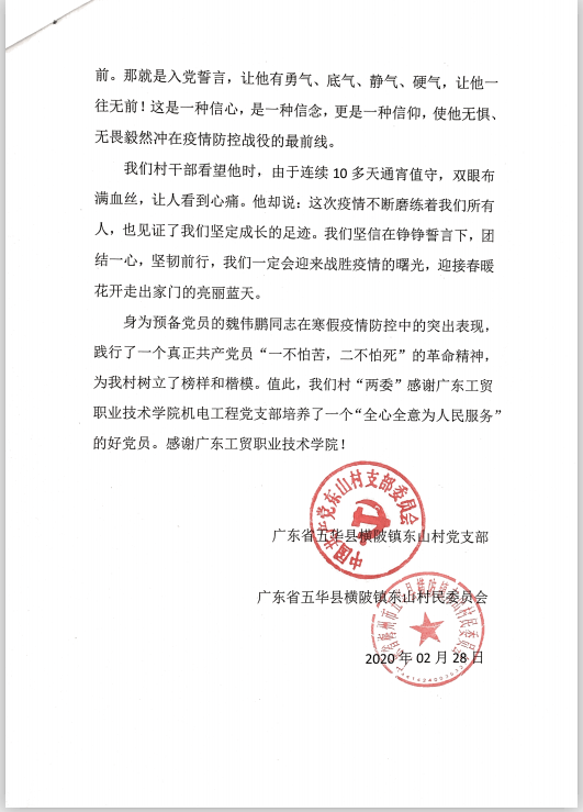 魏伟鹏,太阳集团城官网1407机电工程学院学生第一党支部预备党员。在家乡五华县横陂镇东山村抗击新型冠状病毒肺炎疫情严峻态势下,该同志闻令而动、冲锋在前,入户登记排查、站点值班值守、测温控制人流、协调人员出入,以最坚定的意志、最顽强的作风,做好疫情防控的每一项工作,为坚决遏制疫情扩散蔓延势头、守护好人民群众生命健康,做了大量艰苦工作,付出了巨大努力。