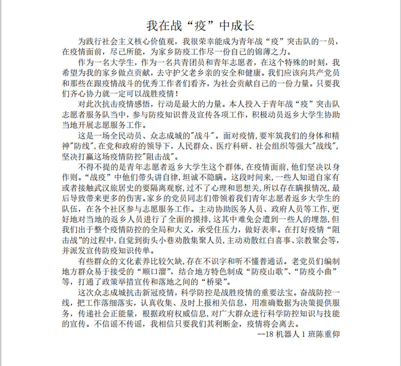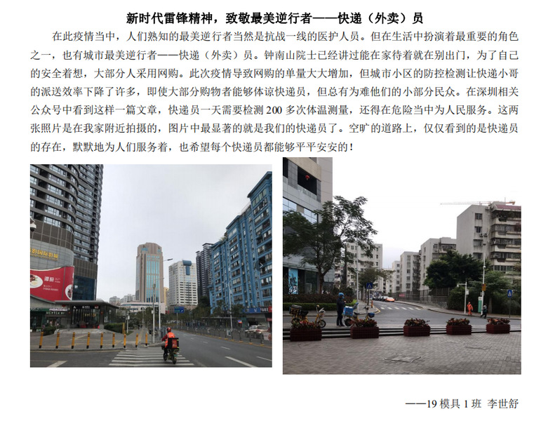同学们从不同媒介了解各行各业人员为抗“疫”奉献自己的力量,并从文字中、镜头下表达对新时代“雷锋”同志们的赞赏。作为新时代大学生,在抗“疫”期间,坚持减少外出、不聚餐、勤洗手、外出戴口罩,不为国家添乱。同时,在家上网课,更要努力学习,珍惜时间,成为社会有用之才,为祖国的发展、社会的进步做出应有的贡献。