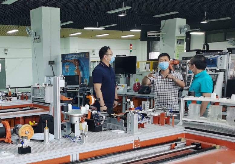 14日上午,王总一行赴我校白云校区参观,在机电学院卢伟明、王锐斌老师的陪同下实地了解了我校智能制造相关的实训设备、场所以及实训课程体系。
