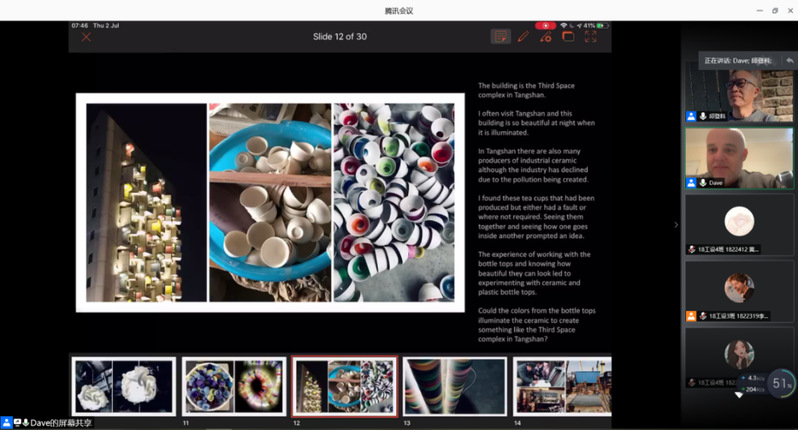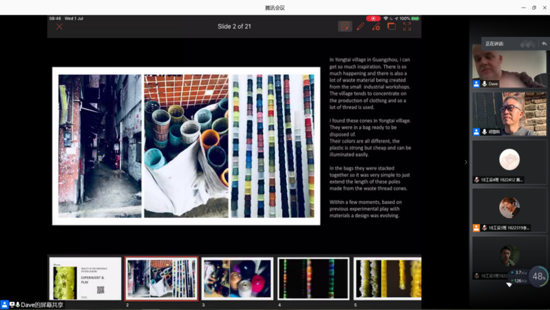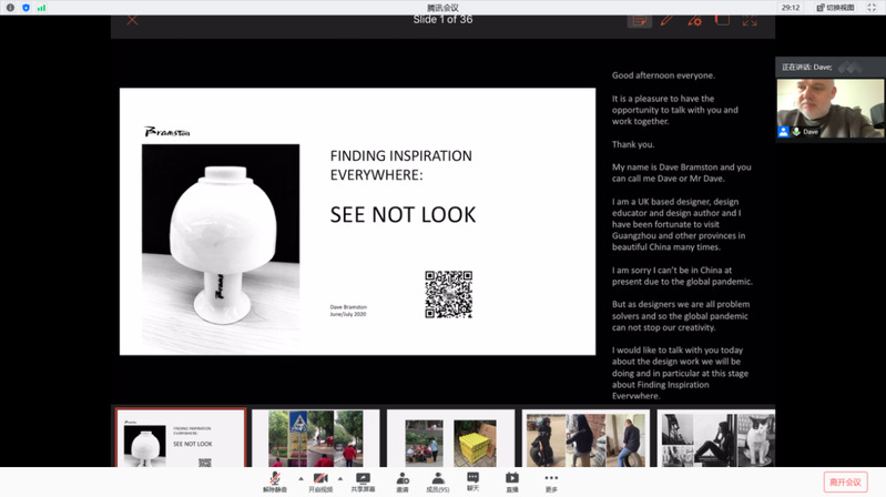 工作坊于2020年6月29号举行了网络开课仪式,徐勇军院长致欢迎辞并对前3届工作坊做了回顾(图1),对同学们的学习提出了相关要求。接着David Bramston教授和邱登科教授做了“设计灵感的来源”为主题的开课讲座(图2-图4)。David Bramston教授将自身的经验授予同学们,如何正确理解Upcycling、认识材料、感知材料,用幽默的语言、渊博的知识、生动的讲解激发了同学们对设计的重新认识以及更加深层次的热爱。