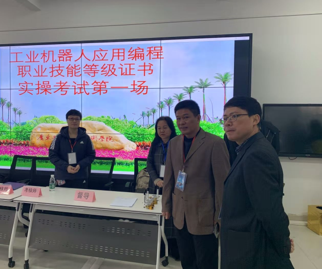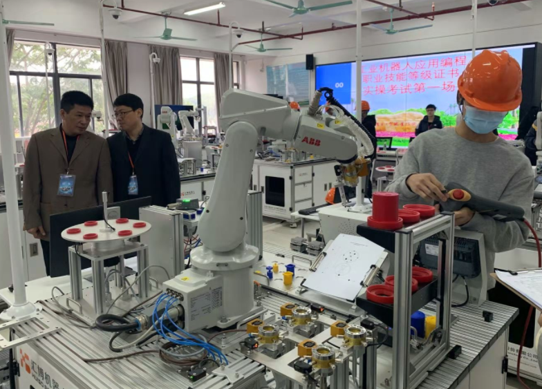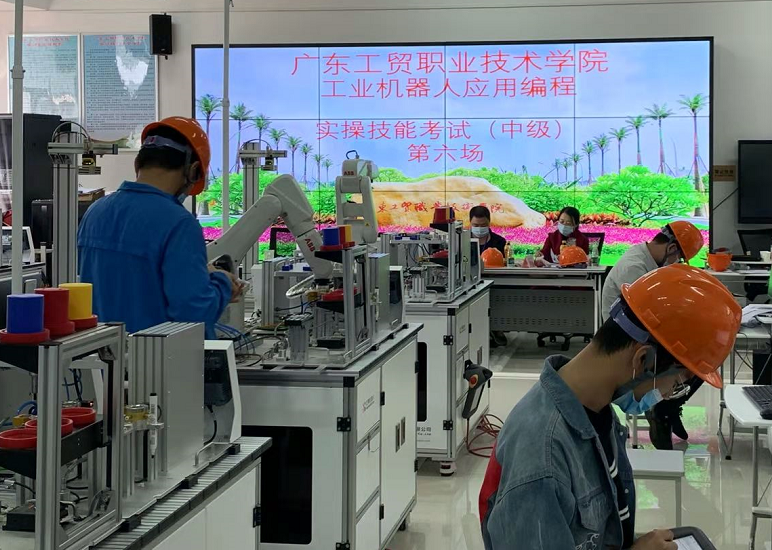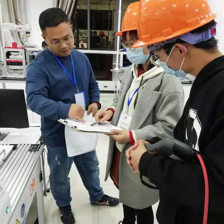 太阳集团城官网1407作为广东省首家“1+X工业机器人应用编程职业技能等级证书”考核管理中心,担任着省内多所院校的考核任务。在时间紧,任务重,设备有限的情况下,机电学院领导班子高度重视并制定出有效的考核管理工作方案,由机电学院电气控制系刘益标主任为核心的教学队伍协同现代制造技术中心共同组建1+X团队,经过两个月的努力奋斗,组织了此次1+X证书的考证工作。本次培训和考核共计142名学生参加,其中我校91人,广州城市职业学院31人、汕头职业技术学院20人。