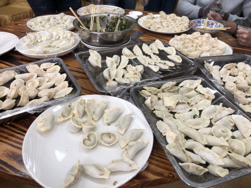 早上,留学生们满怀期待地来到餐厅,准备大展身手,一起做最爱的饺子。备好食材后,同学们目不转睛地看着老师们的动作,同时相互交流着自己的经验,认真的包饺子。不一会儿,桌面上摆满了各种形状的饺子,扁的、元宝型的、花型的。同学们一边包饺子,一边拍照留念美好时刻,师生之间相互配合,忙得不亦乐乎。同时,老师们为留学生讲解中国新年的吃饺子、贴门画等习俗及寓意,加深对中国文化的了解,年味十足。