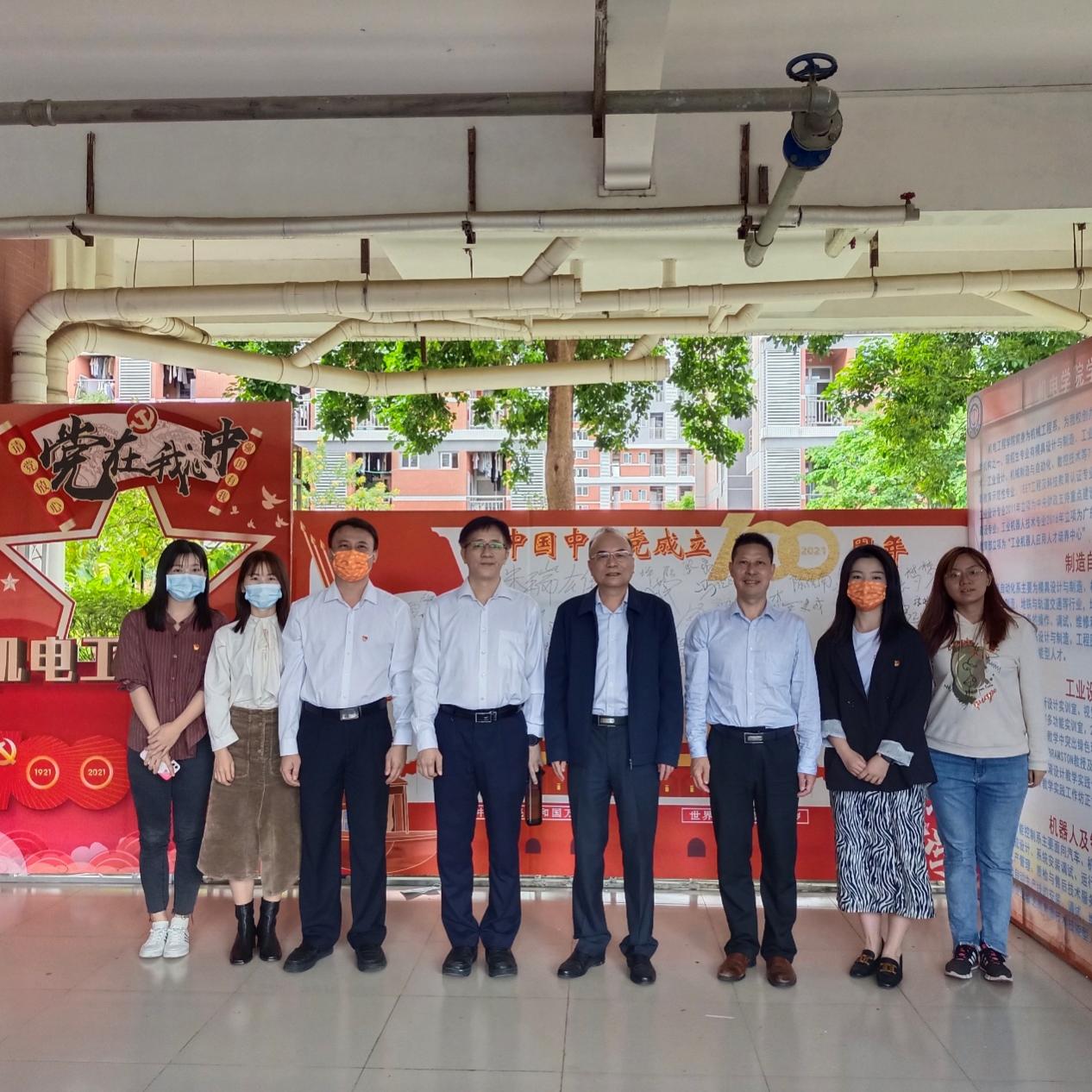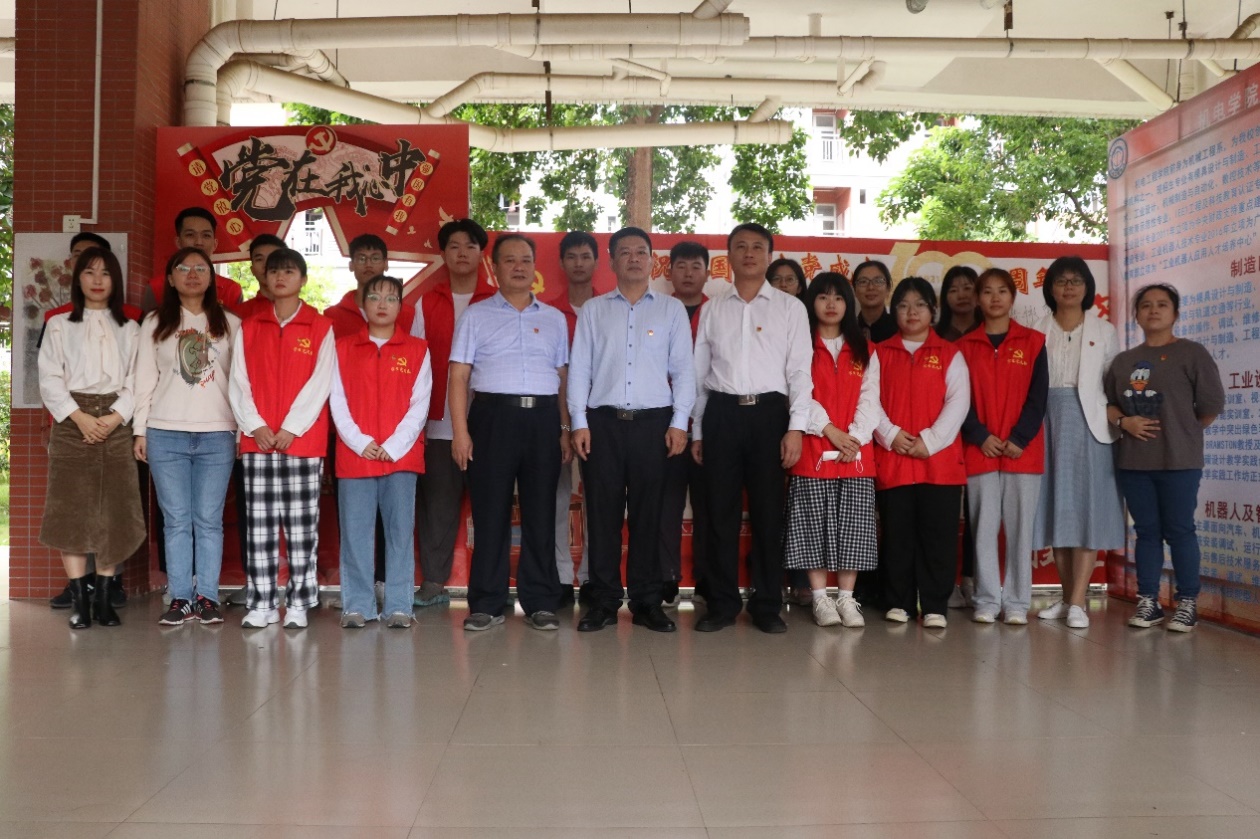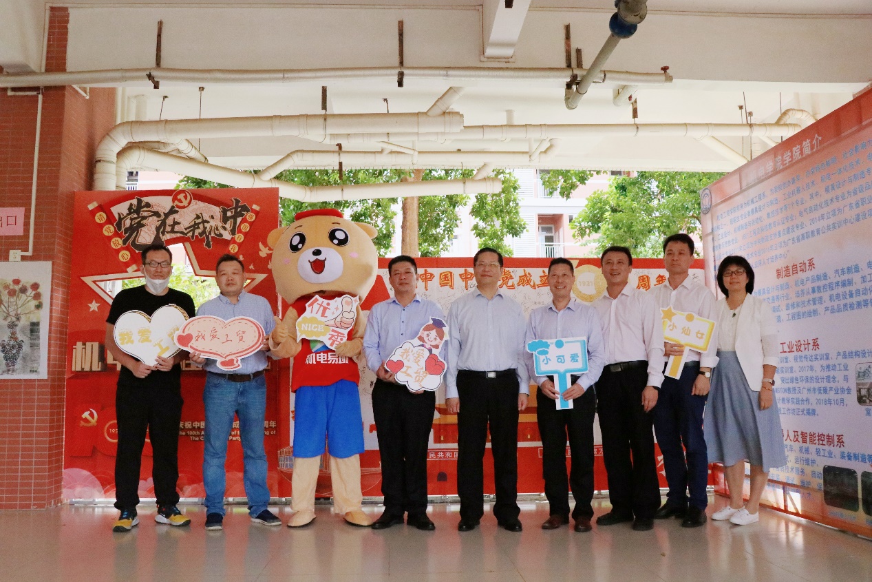 在机电学院迎新接待点,校领导仔细询问新生报到工作进度,对学院有条不紊开展迎新工作给予充分肯定,对工作人员的辛苦付出表示衷心感谢,在机电学院“庆祝中国共产党100周年”的展板签名墙处与老师、志愿者合影。