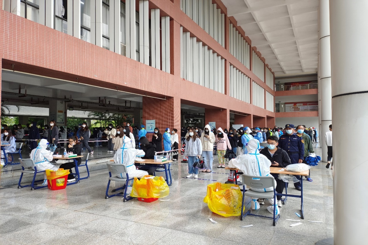 为促使此次检测活动有序进行,医护人员身穿防护服、冒雨前行赶到现场做准备工作,全体师生在退伍军人的指引下按照“分栋模式”有序排队集合,志愿者耐心引导受检师生严格按照疫情防控要求,佩戴好口罩、测温、出示健康码和核酸码,保持1米的间隔排队等候,医护人员反复进行试管贴签、消毒洗手、采集咽拭子、现场采样装管等规范操作,现场秩序井然。