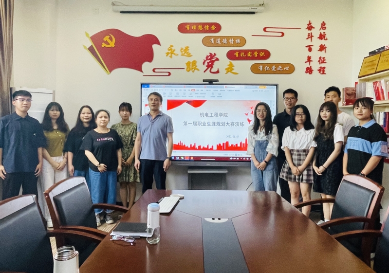 为深入贯彻习近平新时代中国特色社会主义思想和党的十九届六中全会精神,全面贯彻落实2022年全国两会精神和《教育部关于做好2022届全国普通高校毕业生就业创业工作的通知》(教学〔2021〕5号),引导学院学生树立正确的成才观、就业观,科学合理地规划大学学习生活,增强职业素养与就业技能,5月7日下午2点,机电工程学院为进入职业生涯规划大赛校赛的5名同学进行赛前演练。机电工程学院党总支副书记梁超鹏、辅导员覃才尧、徐瑞颖、魏璇、惠梦梦、邵盼盼出席本次赛前演练。