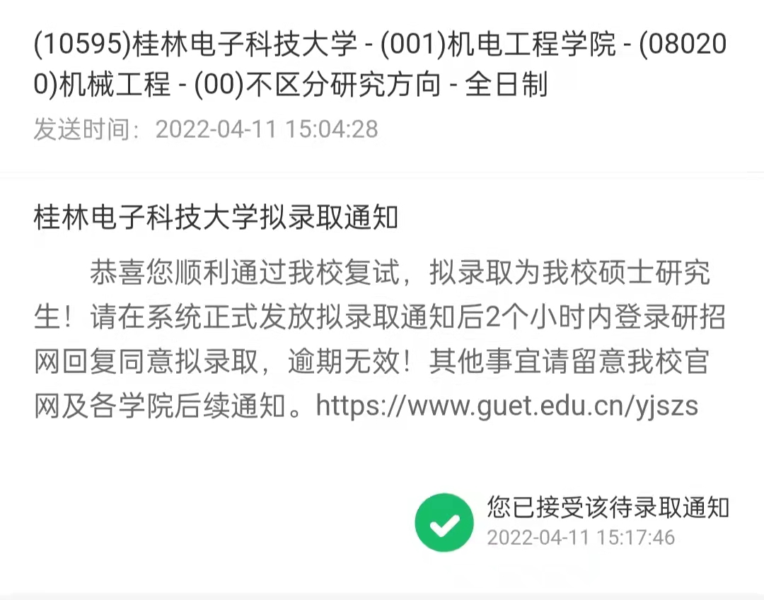 专升本联合培养是现代职业教育体系的组成部分,是高素质高层次应用技术型人才培养的重要方式。机电工程学院20级本科班机械制造与自动化专业学生郑洪鑫原是太阳集团城官网1407一名大专生,通过高本衔接成功考上岭南师范学院。在联合培养中,郑洪鑫再创佳绩、成功考取桂林电子科技大学机械工程专业研究生。