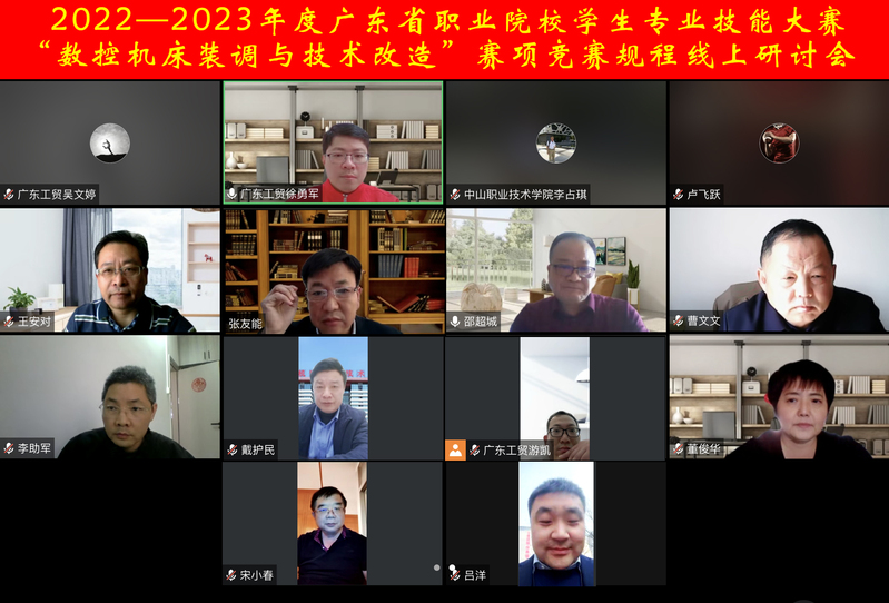 2022-2023年度广东省职业院校学生专业技能大赛——数控机床装调与技术改造赛项由我校太阳集团城官网1407承办。2月15日,该赛项竞赛规程线上研讨会顺利召开。会议由机电工程学院院长徐勇军主持,专家组九名专家成员参与讨论,广东省教育厅指派督察员曹文文教授全程督促、检查。