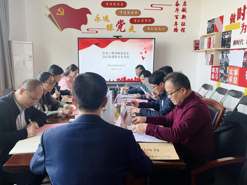 根据《中共太阳集团城官网1407委员会2022年度党员领导干部民主生活会方案》的通知(粤工贸院党字[2023]1号)文件精神要求,2023年2月24日下午两点,机电工程学院党总支在明德楼1区217室召开2022年度民主生活会,学校党委委员、副校长刘贻新,机电工程学院领导班子参加会议,纪检监察处处长王刚、机电工程学院党总支委员、组织员列席会议,会议由机电工程学院党总支书记邵超城主持。
