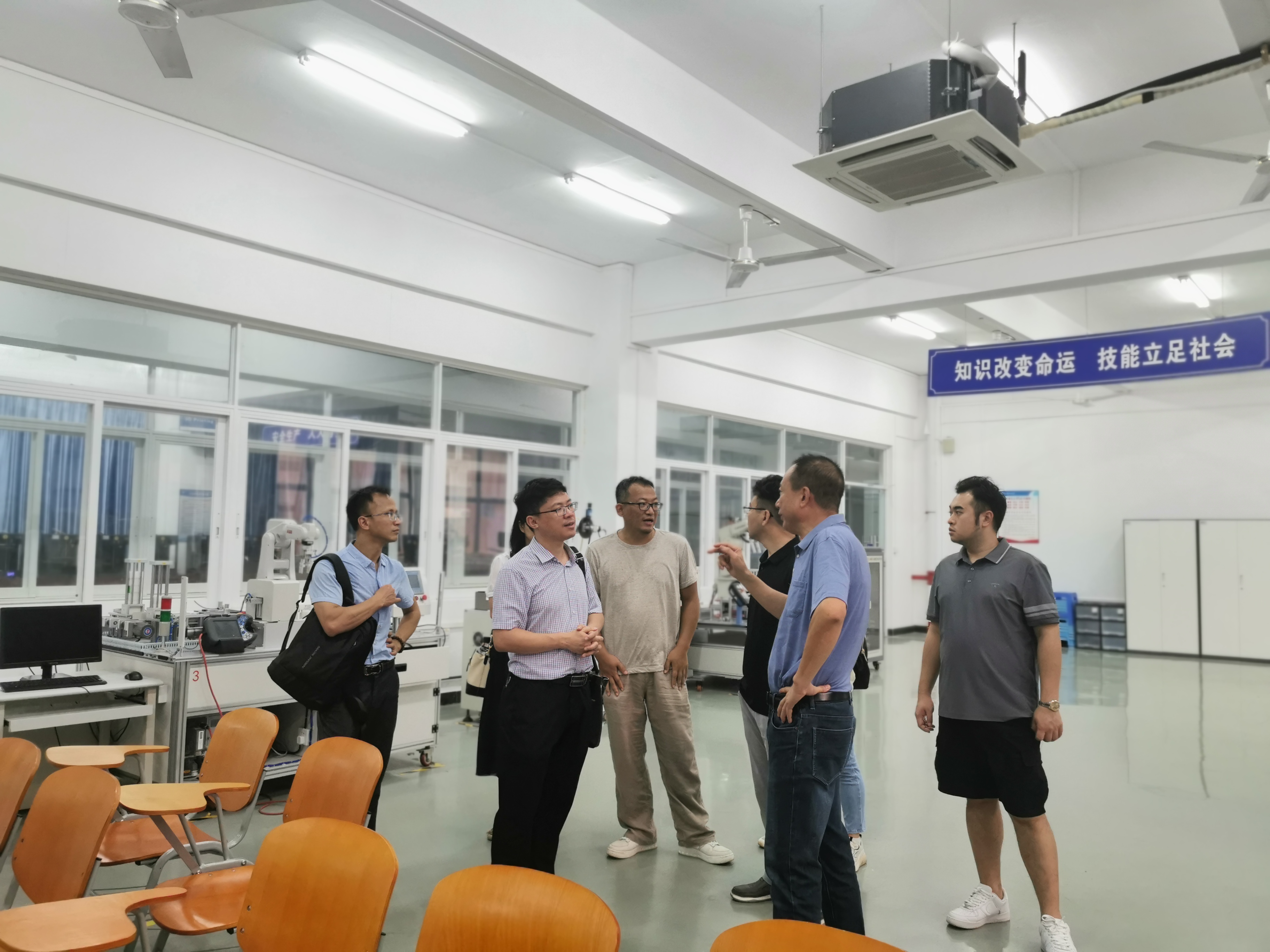 随后调研组赴广州番禺职业技术学院进行实训室建设调研。智能制造学院院长院长卢飞跃带领我们参观实训室,并分享实训室管理模式,对实训室建设给予很多建设性的意见。