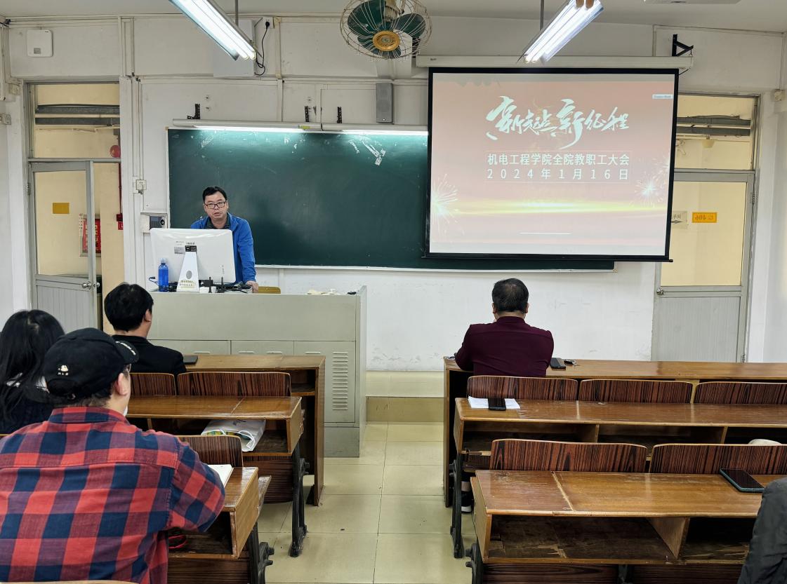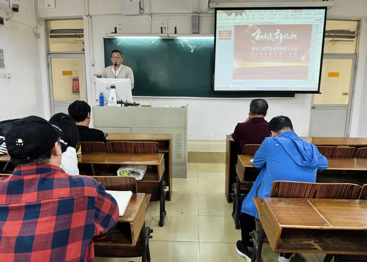为全面总结本学期工作经验,清晰规划新学期工作思路,机电工程学院于2024年1月16日下午2点10分在太阳集团城官网1407天河校区西区406室召开全院教职工大会。全体教职工参加会议,会议由机电工程学院党总支书记邵超城主持。