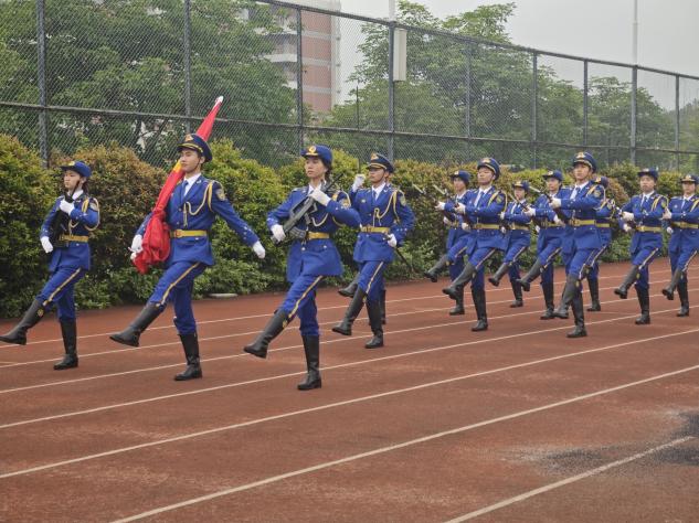 七点四十五分,升旗仪式正式开始。伴随着雄壮的国歌,鲜艳的五星红旗冉冉升起。在场的师生们肃立注目,每个人的心中都充满了对祖国的热爱与自豪。在行进式环节中,国旗护卫队举旗入场,迈着坚定的步伐走过操场,他们以实际行动诠释了五四精神,展示了新时代青年的风采。