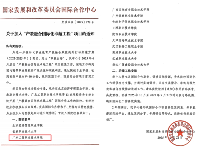 近日,国家发展和改革委员会国际合作中心正式发布《关于加入“产教融合国际化卓越工程”项目的通知》(发改国合〔2025〕279号),标志着我国职业教育国际化合作迈入新阶段。该项目旨在推动《职业教育产教融合赋能提升行动实施方案(2023—2025年)》落地,支持职业院校服务国家战略、提升国际化办学水平。经严格遴选,我校作为广东省代表院校之一,成功入选全国首批13所院校,标志着学校在国际化办学方面取得重要突破。