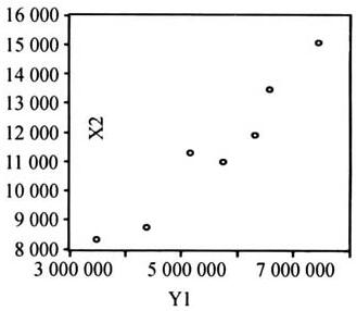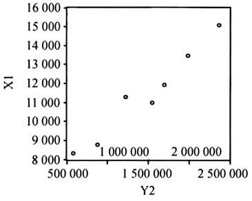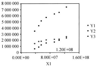 评价高职教育投入效益计量分析方法,主要有舒尔茨的投资增量分析法、丹尼森的增长因素分析法等。唐文忠(2015)以2005-2011年数据②为样本,通过Eviews软件对投入经费(X1)、生均经费(X2)、招生数(Y1)、毕业生数(Y2)、在校生数(Y3)及毕业生月收入(Y4)等进行计量分析发现:毕业生数、招生数与投入经费成线性关系,如图1所示。提高教育经费投入能带来高职招生增加与毕业生增加;毕业生月收入与生均经费(前期)成非线性关系,但与生均经费(后期③)成明显线性关系,如图2所示[4]。