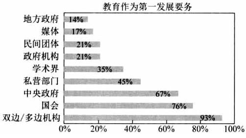 国际组织早期的教育援助实践及其成效受到了质疑。主要张力来源于于全球化与地方化的关系,或者说“超国家”组织与“民族国家”的关系。例如,Brock-Utne(2000,p.141)曾指责捐赠机构更为支持国际语言,而这恰恰阻碍了本土的教育发展,抑制了本土语言写作的当地教材的发行,削弱了当地的文化。而今,虽然超越国界的政策行动体(policy actor)越来越多,但是国际组织在教育治理中愈加重视国家政府,甚至地方政府在改进教育中的作用。《教育2030行动框架》中提出:政府要基于国家经验和优先事项,履行对教育的政治领导责任,指导本地化进程和“教育2030”总目标及其具体目标的实施,同时与其他关键合作伙伴一道,确保透明和全纳的进程(《教育2030行动框架》起草委员会,2016)。然而根据世界银行2016年的公共意见调查,我们可以发现国际组织和地方政府对“教育作为第一发展要务”的认识还存在着巨大的落差(详见图1)。