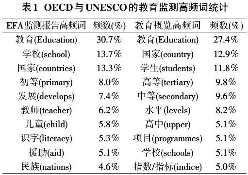 本研究以OECD的《教育概览》和UNESCO的《全民教育全球监测报告》为对象,选取1998-2016年的文本,利用Nvivo11进行词频分析。在词频查询时,选择“留存的字根”(以Education为例,与其持相同词根的单词如educated,educating,educational等均计算入内),且剔除无意义的数字或年度报告的惯用语词,得出具有实指意义的高频词汇比例如表1。